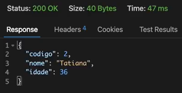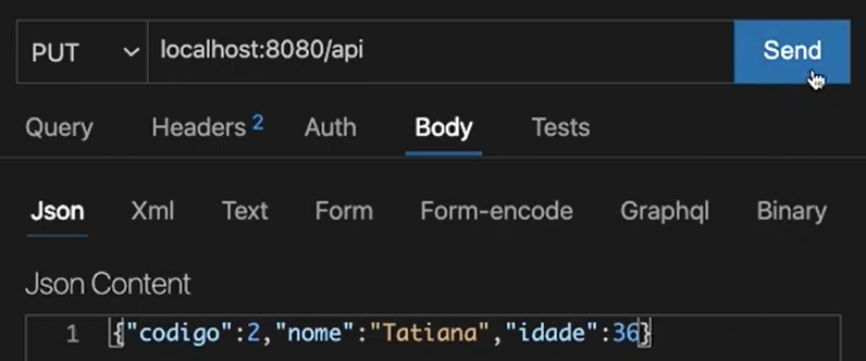 Ele funciona de maneira parecida com o cadastro, porém para que funcione, será necessário passar um objeto completo, contendo todas as características de uma pessoa. Nosso modelo é composto por: código, nome e idade, então para que funcione, será necessário passar todos esses dados.