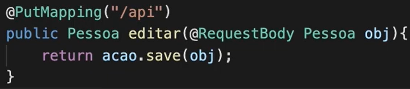 Utilizamos também uma nova annotation de requisição, chamada @PutMapping, que faz com que nossa API saiba que uma rota com esse tipo de requisição será responsável por atualizar um registro.