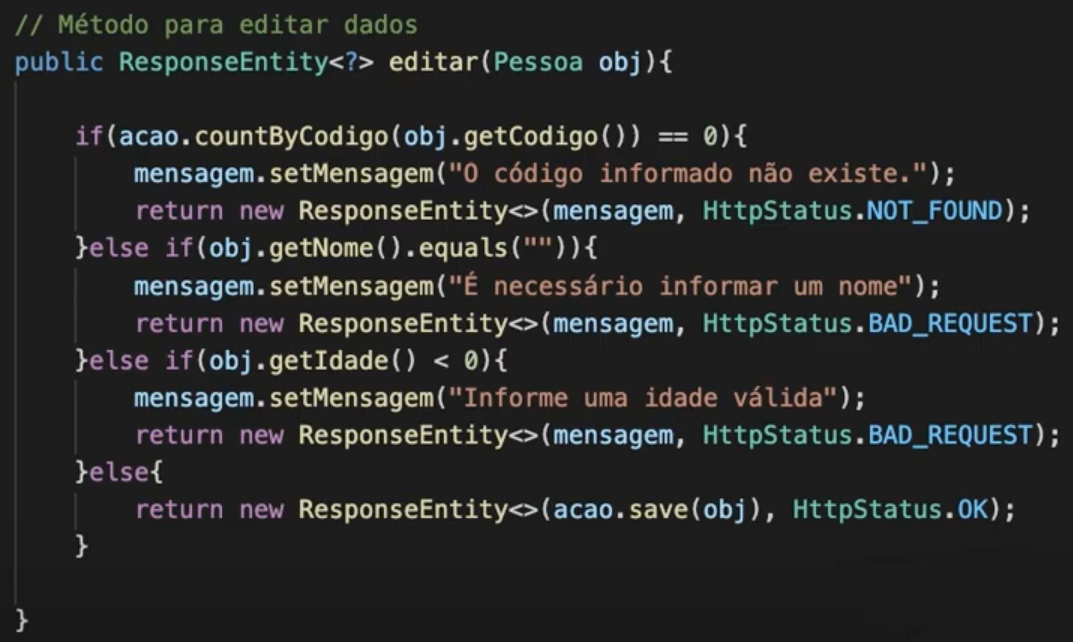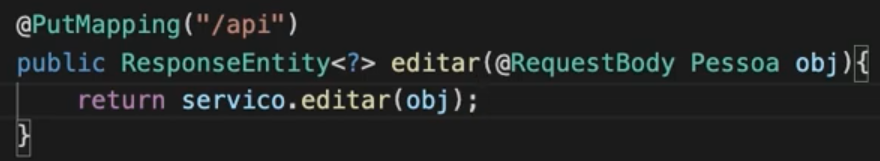 Inicialmente iremos criar no arquivo Servico.java um método para realizar a atualização de um registro, haverá uma validação para garantirmos que os dados informados realmente estão condizentes para efetuar a ação: