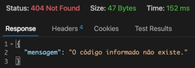 Nesse teste de maneira proposital, informei um código que não existe, sendo assim teremos o seguinte retorno:
