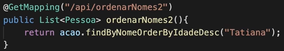 Note que o nome dado ao método foi: findByNomeOrderByIdadeDesc, findByNome fará com que haja uma filtragem através do nome, já o ByIdadeDesc, irá ordenar da maior idade para a menor.