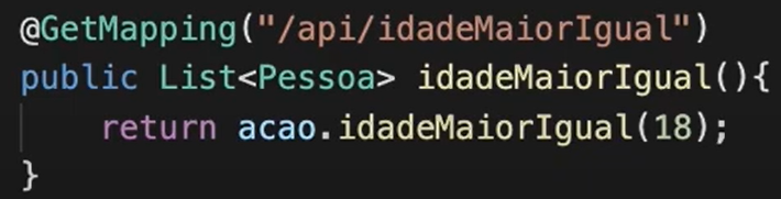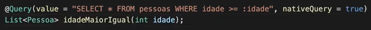 Para podermos manipular parâmetros em nossa @Query, basta utilizar os dois pontos, seguido do nome do parâmetro da função, nesse exemplo para extrairmos a idade do método idadeMaiorIgual, utilizaremos a expressão :idade. Em nosso controle podemos implementar a seguinte rota: