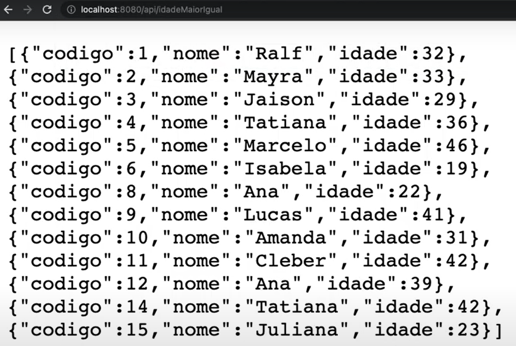 Podemos testar, abra o navegador e acesse o link: localhost:8080/api/idadeMaiorIgual, o resultado será esse: