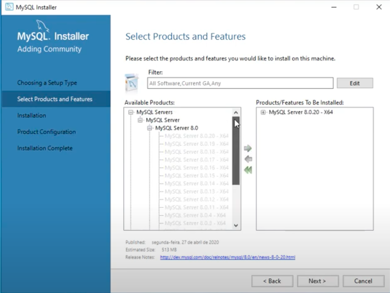 5º Na lateral esquerda selecione: MySQL Servers > MySQL Server > MySQL Server 8.0 e clique na versão mais atual. Depois de selecionado, clique em Next.